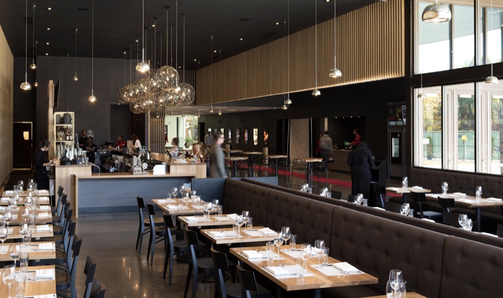 Former big box retail shell built in 1972, partially demolished and remodeled into an upscale 13-screen theater, bar, and restaurant venue. The 52,500-square-foot Silverspot Cinema shows independent and foreign films as well as blockbusters and 3D films. Off the main lobby the theater also has a casual dining and lounge area featuring innovative American cuisine in a restaurant or bar & lounge setting. Slatted wood paneling, warm wood tops, decorative metal accents, and pendant lights lend the bar a warm, contemporary flair.