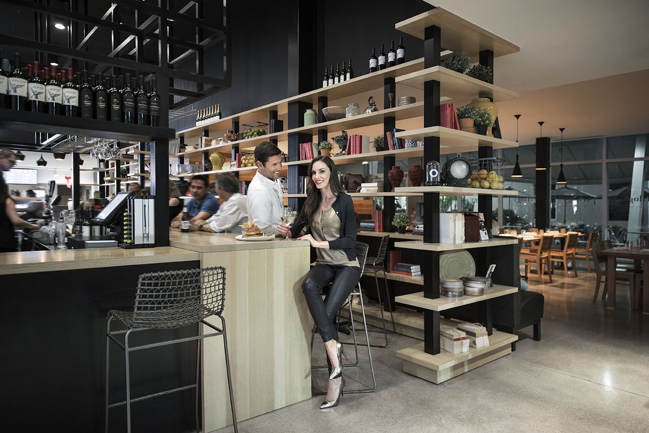 The theater also has a 150-seat casual dining and lounge area featuring innovative American cuisine in a restaurant or bar & lounge setting. Slatted wood shelving, warm wood furniture, eclectic furnishings, and pendant lights lend a contemporary flair to the bar and lounge.