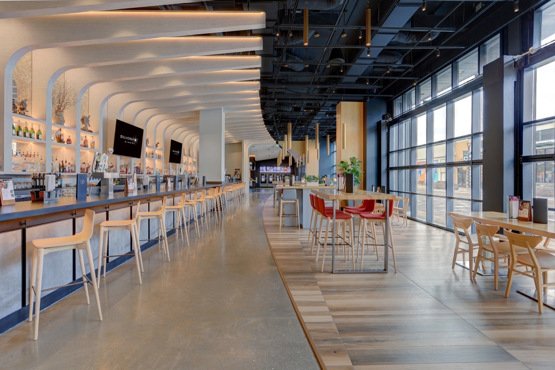 Collins | Webb Architecture worked closely with the development team as the Shell Architect, in addition to the Tenant Architect for Silverspot Cinema, incorporating Silverspot Cinema’s branded interiors. Located on the East side of the town center, Brookfield’s boutique state-of-the-art entertainment theater features a sleek concierge, bar, and lounge on the main floor with indoor seating for more than 70 guests, nine auditoriums divided between three stories, a commercial kitchen providing in-theater dining, and an outdoor patio. Direct elevator access into the lounge is also incorporated from The Corners’ expansive covered parking, providing protection during inclement weather.